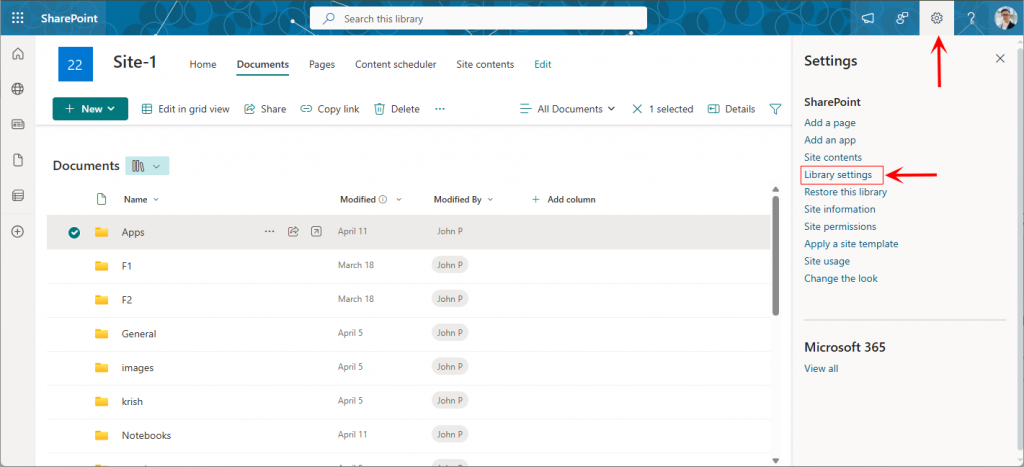 • Select the item within the site, click the gear icon in the top-right corner, and then choose Library settings from the menu.