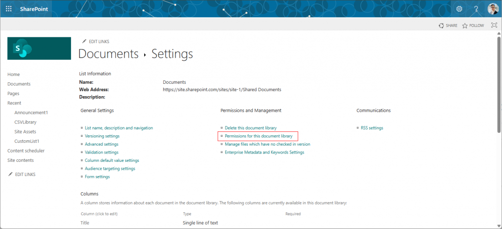 • Click on Permissions for this document library under the Permissions and Management section.