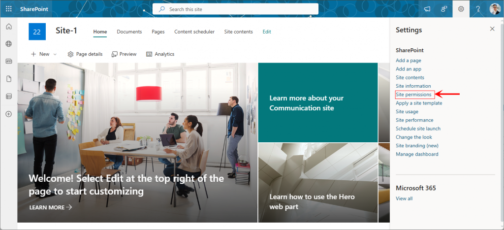 • Select the desired site, click the gear icon in the top-right corner, and then choose Site Permissions from the menu.