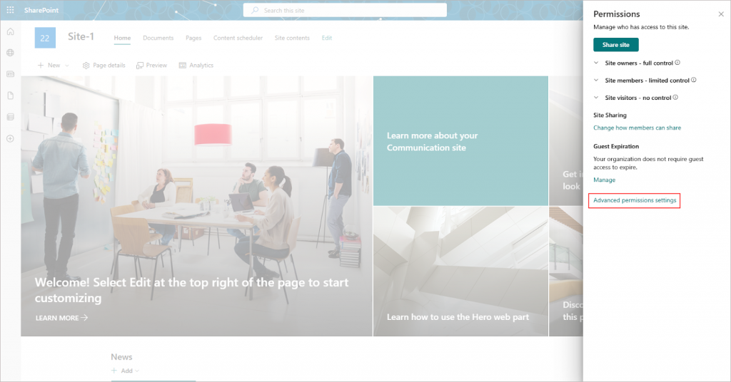 • Click on Advanced permissions settings to access detailed permission management for the site.